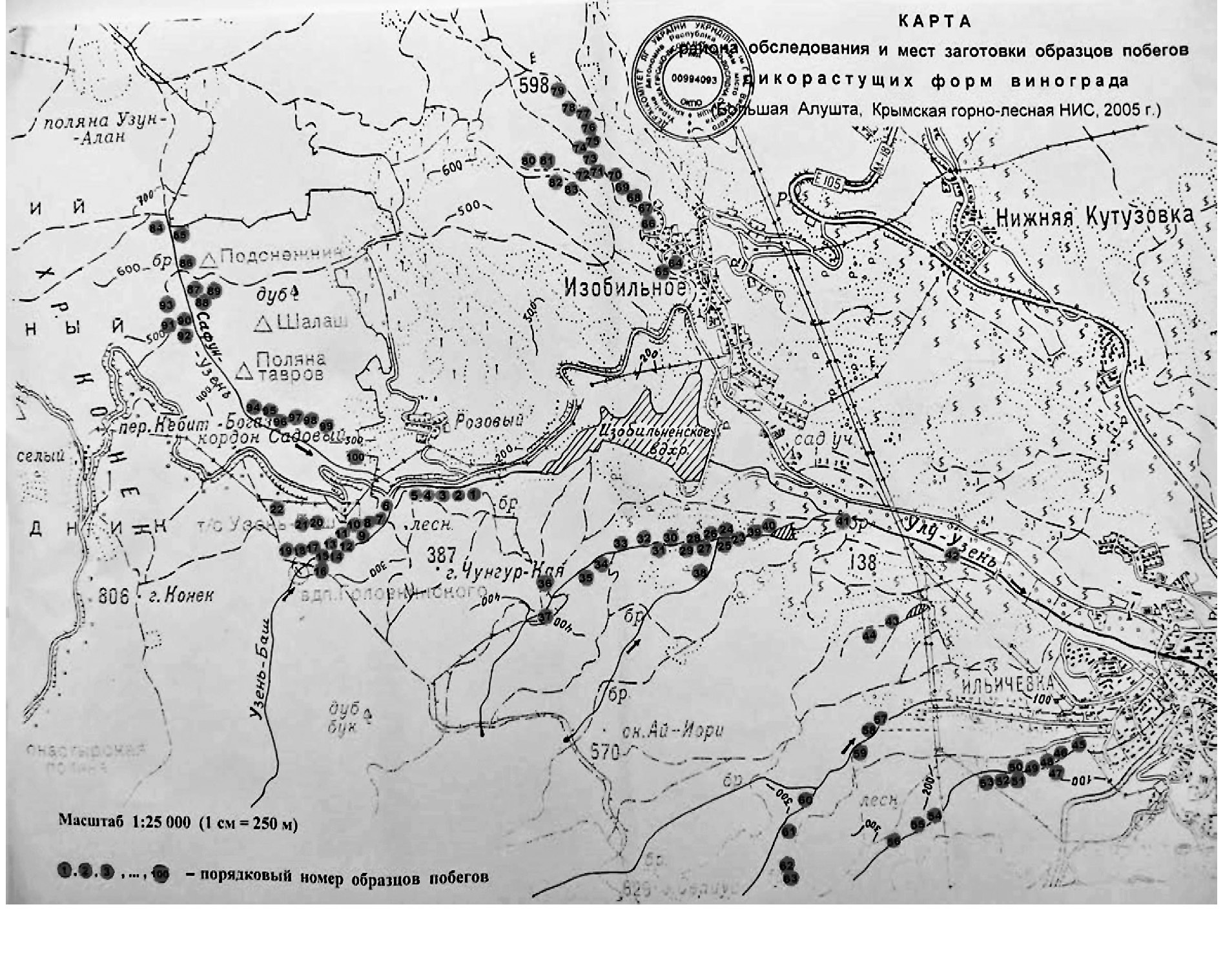 Рис. 1. Распространение форм Vitis vinifera ssp. sylvestris в бассейне реки Улу-Узень (Крым, г. Алушта, 2006 год).