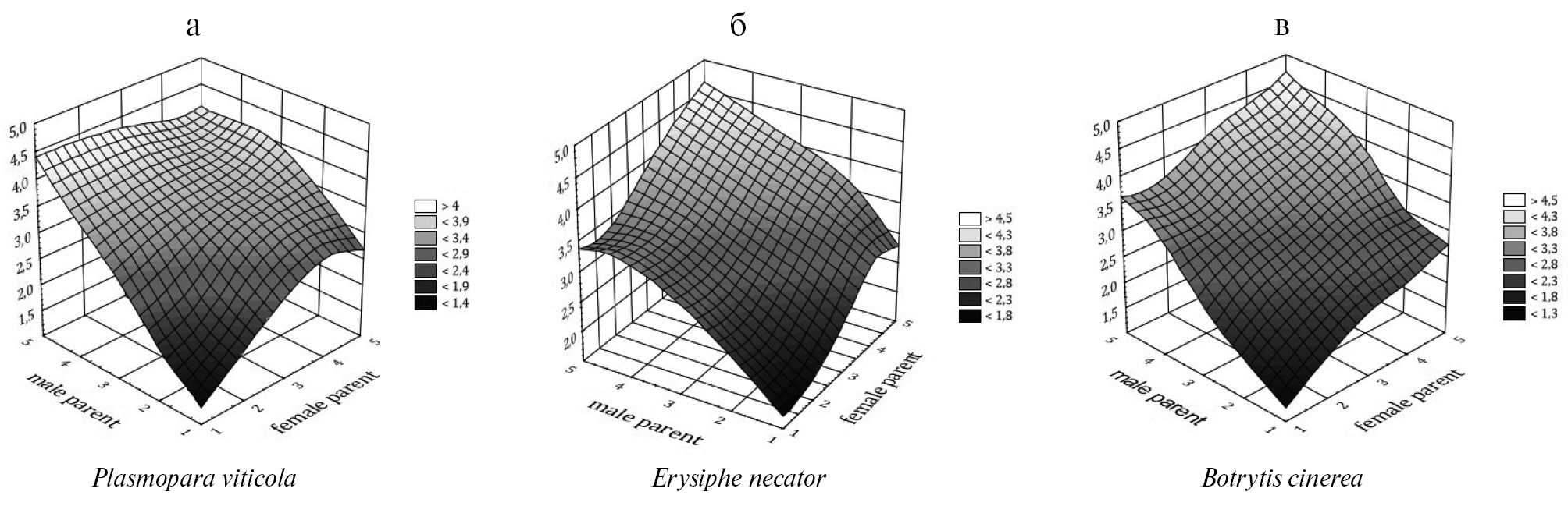 Общие генетически детерминированные закономерности селекции сортов винограда, устойчивых к комплексу возбудителей, изучены традиционными методами, основанными на гибридологическом анализе. Патогены принципиально различались по своей биологической природе и отношению к растению винограда как растению-хозяину. Устойчивость исходных форм и их комбинационная способность выступают факторами, лежащими в основе устойчивости потомства (рис. 5). Отцовская форма влияет на устойчивость потомства к Plasmopara viticola. На рисунках 5б и 5в показан синергизм влияния отцовской и материнской форм на устойчивость к Erysiphe necator и Botrytis cinerea, при этом он более выражен к Botrytis cinerea.