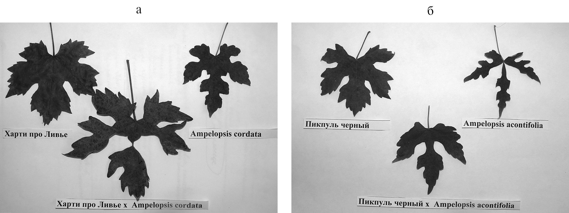 Рис. 6. Листья исходных родительских форм Харти про Ливье и Ampelopsis cordata (а), Пикпуль черный и Ampelopsis acontifolia (б) и сеянцев, полученных в результате их гибридизации.