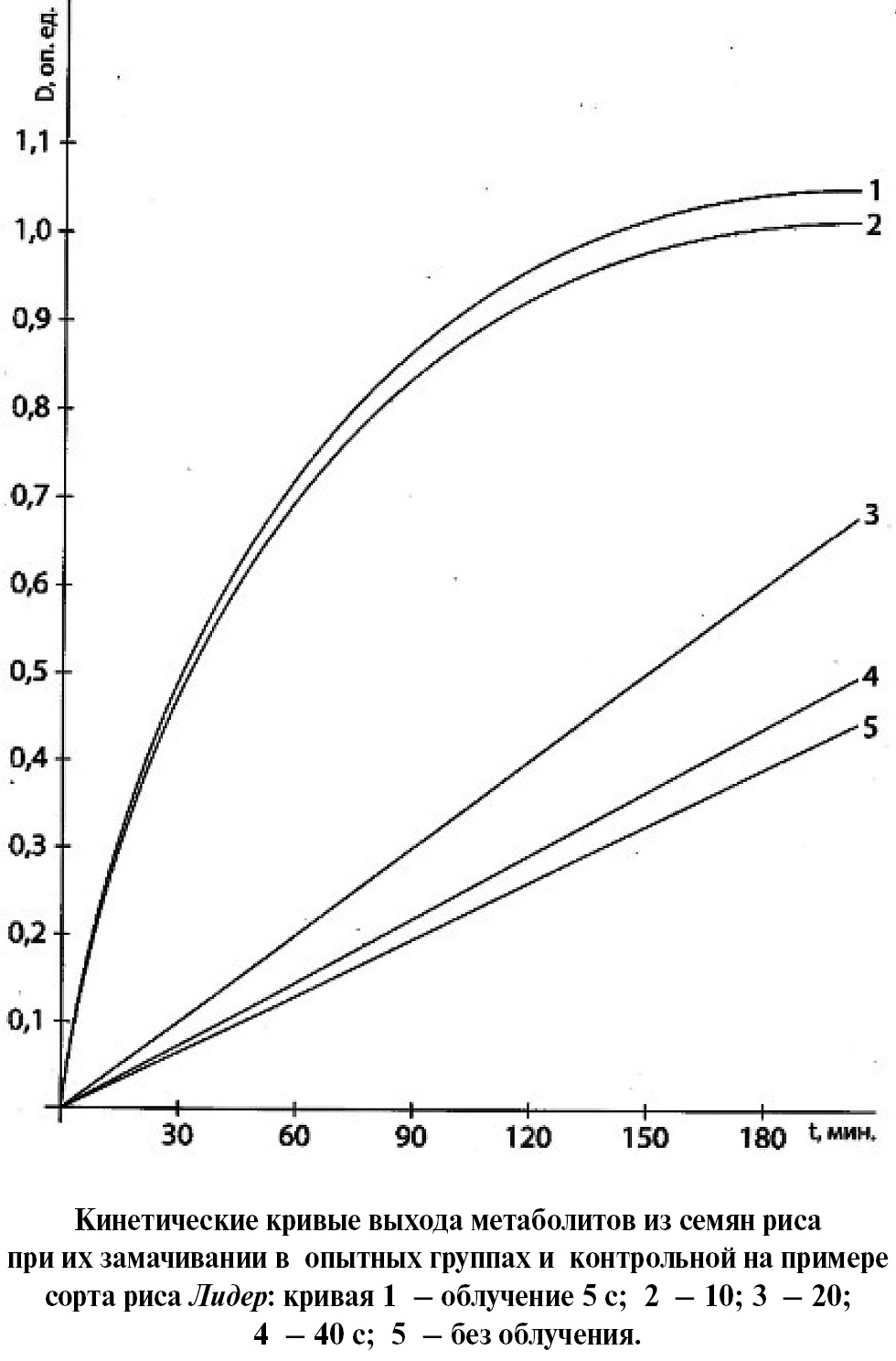 На примере сорта риса Лидер, как более изученного, через 1,5 ч после 5, 10, 20 и 40 с облучения формировали опытные и контрольную группы семян (n = 10) и замачивали в 6 мл дистиллированной воды. [7] Определяли кинетические кривые выхода метаболитов в водную среду в течение 180 мин. Спектры поглощения метаболитов записывали на спектрофотометре Specord UV-VIS при λmax = 207 нм. Измерение вели в кварцевой кювете с длиной оптического пути 1 см.
