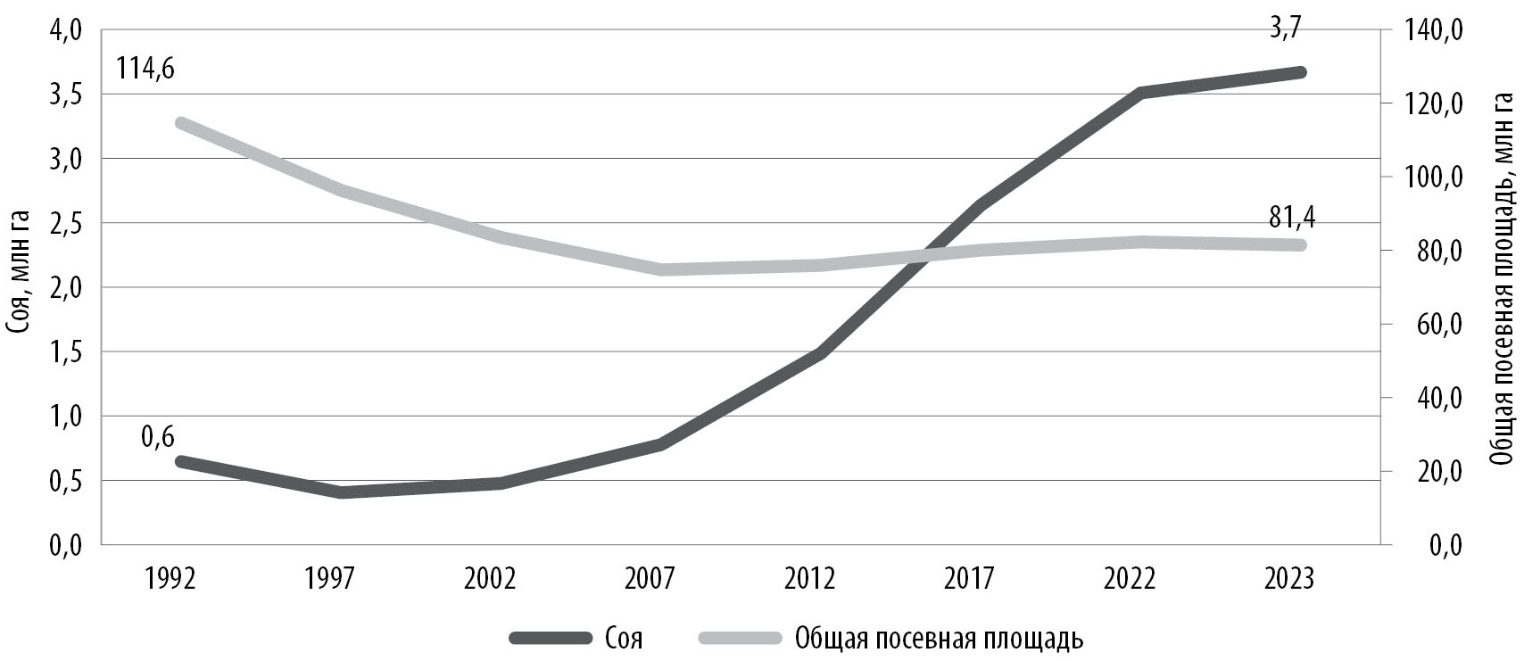 Рис.1. Общая посевная площадь и площадь сои в России, 1992–2023 годы, млн га.