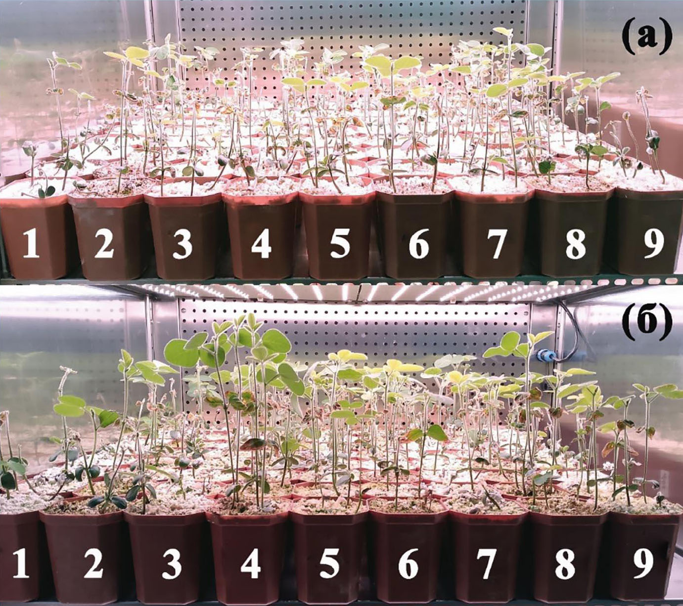 Рис. 1. Вид проведения опыта в фитотроне. Номера вариантов соответствуют обозначениям в таблице: а - без внесения добавки NPK, б - добавка NPK