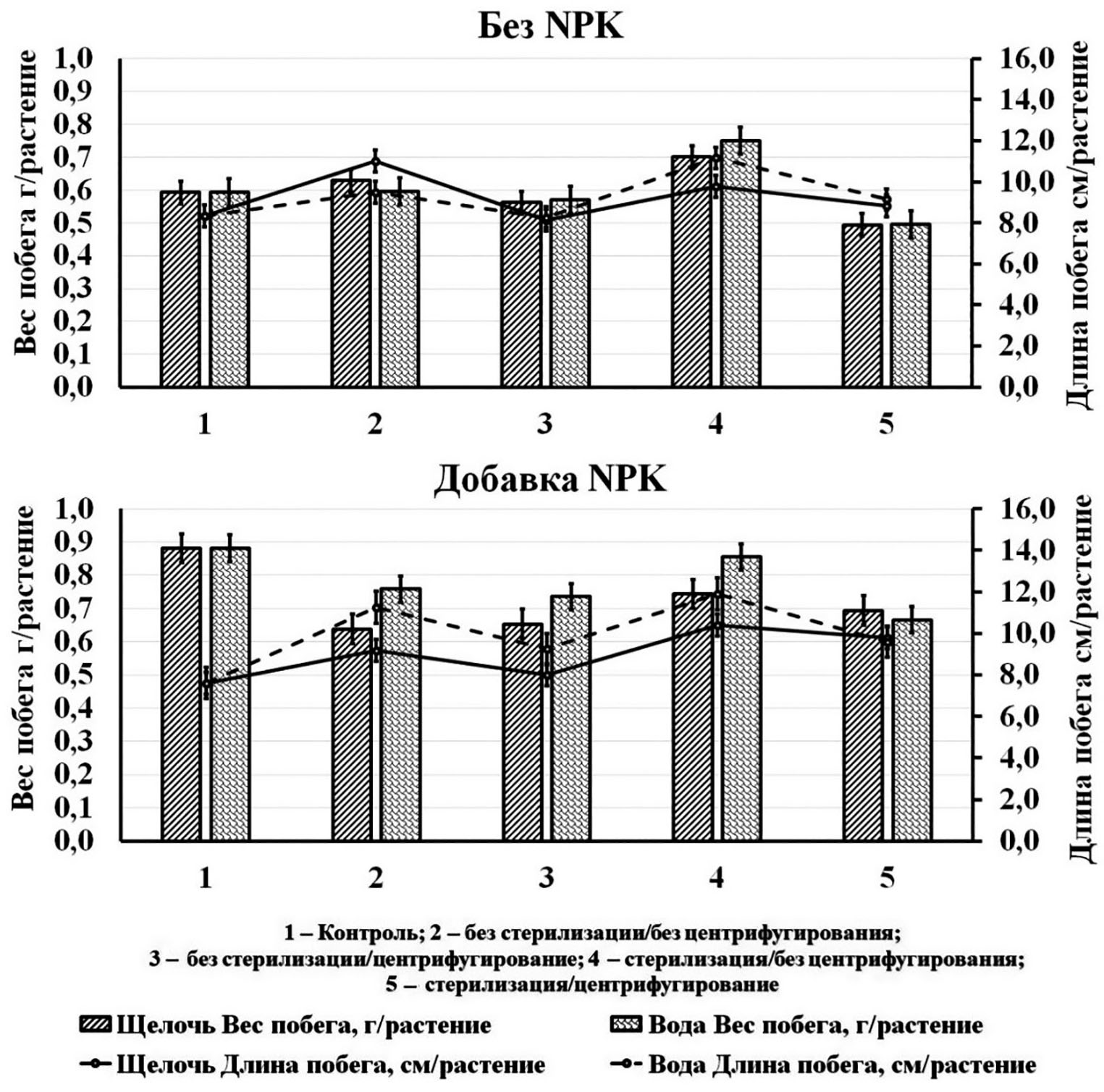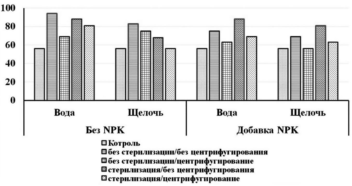 На фоне органики вариант занимал первое место и при щелочном экстрагировании. Второе место у варианта, где суспензию предварительно стерилизовали. На фоне NPK ситуация была обратной, на первое место вышел вариант со стерилизацией без центрифугирования, а также с добавкой водного экстракта зоогумуса.