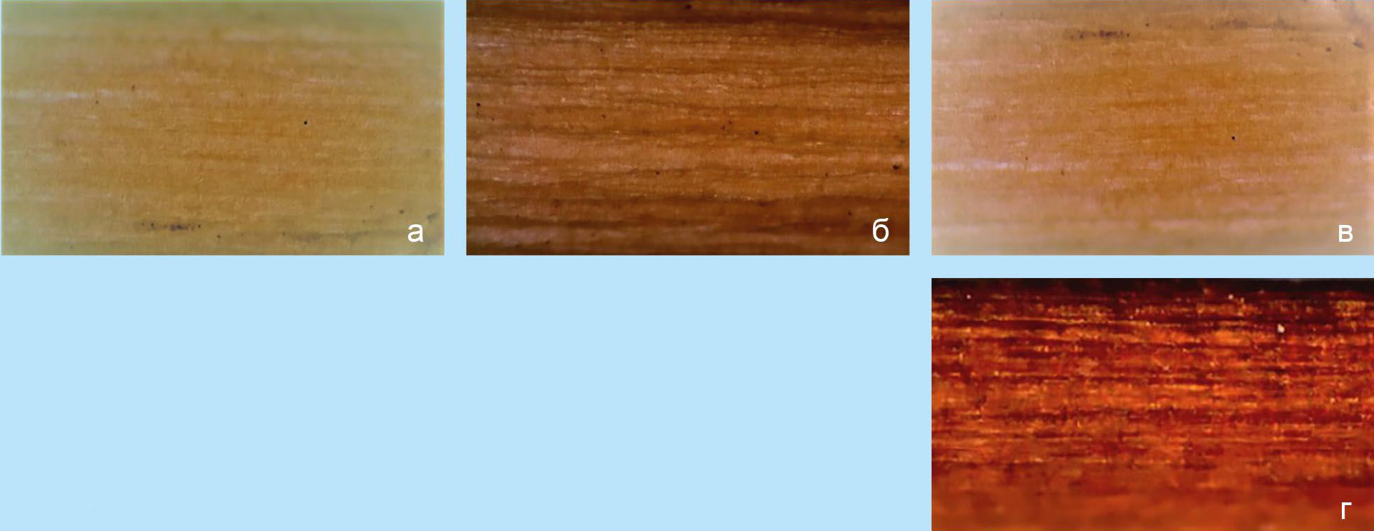 Рис. 1. Результаты высокотемпературного воздействия 10%-х водных растворов активных реагентов на структуру поверхностисоломы льна-долгунца: а - без воздействия; б - гидроксид натрия; в - пероксид водорода; г - бисульфит натрия.
