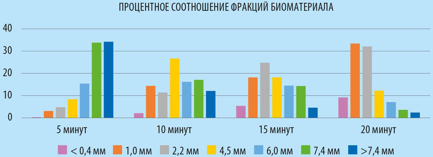 Для интенсификации процесса воздействия растворов активных реагентов на биоматериал измельчили солому льна. Гранулометрический состав биоматериала, полученного в результате размола льняной соломы, представлен на рисунке 2 (2-я стр. обл.). Показатели фракций установлены по весовому составу в результате разделения на ситах. В дальнейших экспериментах задействовали состав, полученный при двадцатиминутном размоле, после отделения последней фракции, размеры частиц превышали 7,4 мм.