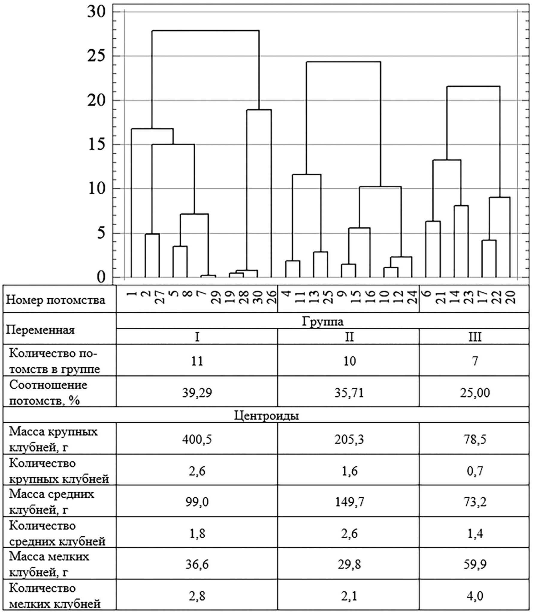 Результаты классификации вегетативных потомств приведены на примере сорта Импала (см. рисунок). Кластерный анализ, поддержанный на 100% пошаговым дискриминантным, выявил три группы потомств. Первая (39,3%) отличалась максимальной продуктивностью из-за количества и массы клубней крупной фракции. Вторая (35,7%) – промежуточными показателями урожая с наибольшими значениями количества и массы клубней средней фракции. Потомства третьей группы (25%) оказались наименее продуктивными. Основные дискриминаторы (переменные, достоверно разделяющие потомства на группы) – количество клубней крупной фракции, масса клубней средней и мелкой фракций.