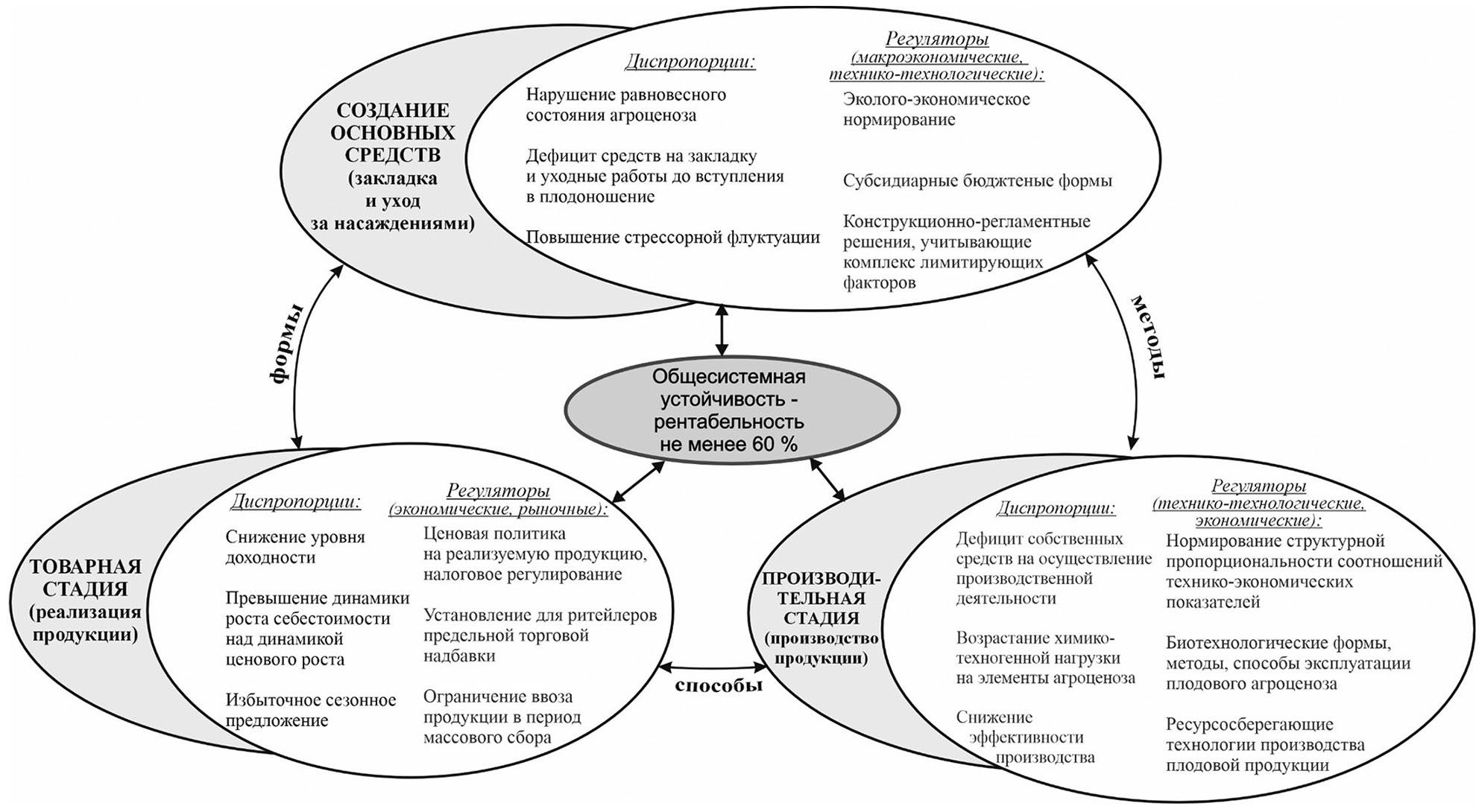 Система регуляторов обеспечения устойчивости воспроизводственных процессов включает: макроэкономические – возмещение части затрат на закладку и уход за многолетними насаждениями, в том числе питомниками в рамках «единой» субсидии, установку шпалеры и противоградовой сетки в садах интенсивного типа, приобретение систем капельного орошения; налоговое регулирование; технико-технологические – нормативная структуризация производства, оперативное управление; экономические – параметрическая оптимизация и нормативная регламентация показателей; рыночные – ценообразование на плодовую продукцию с правом отечественного товаропроизводителя на первоочередную реализацию.