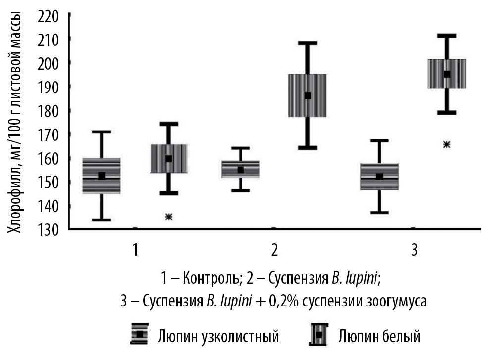 Рис. 3. Влияние суспензии зоогумуса на содержание общего хлорофилла в листьях люпино-ризобиальной симбиосистемы в конце опыта.