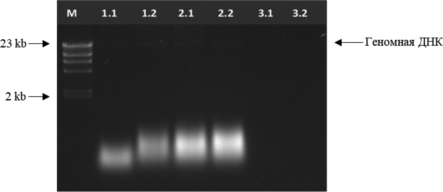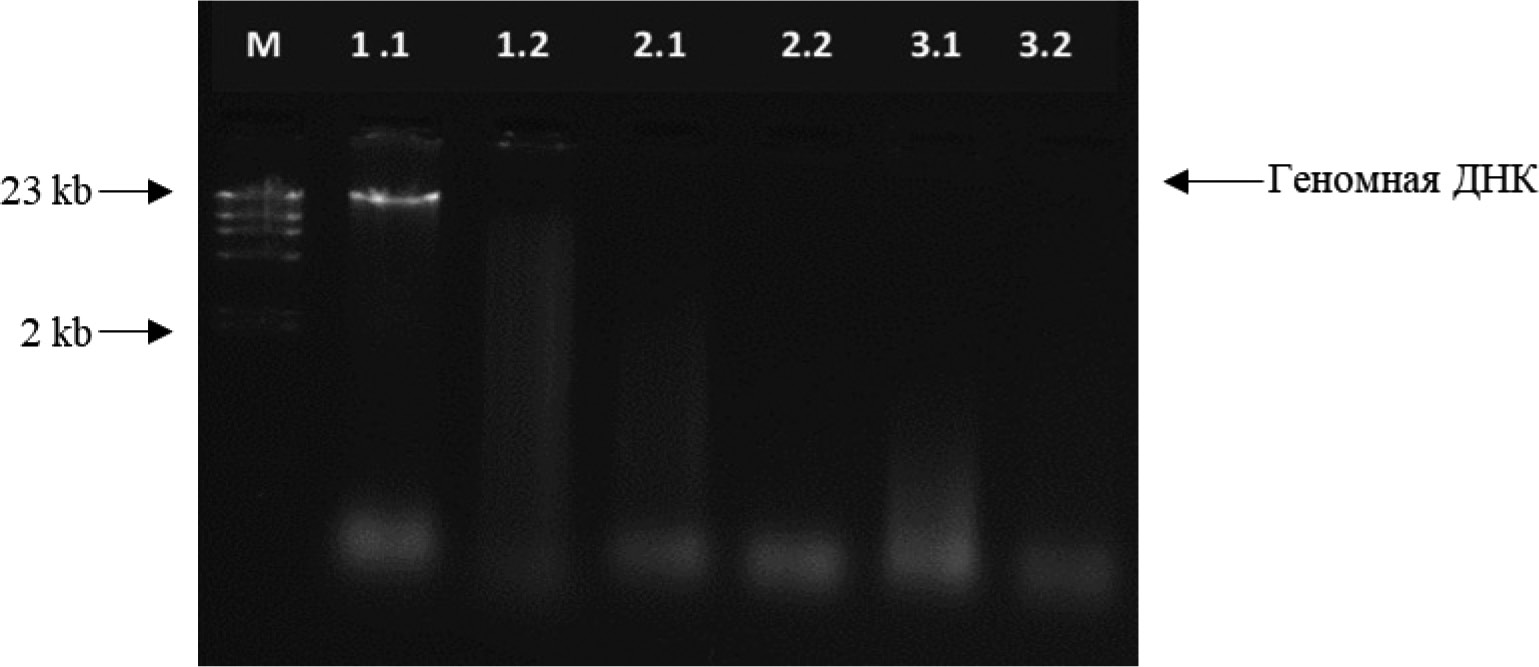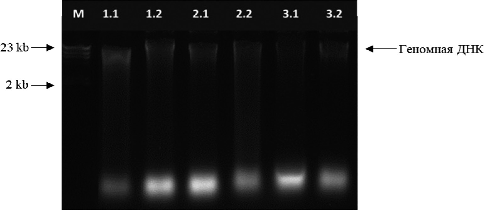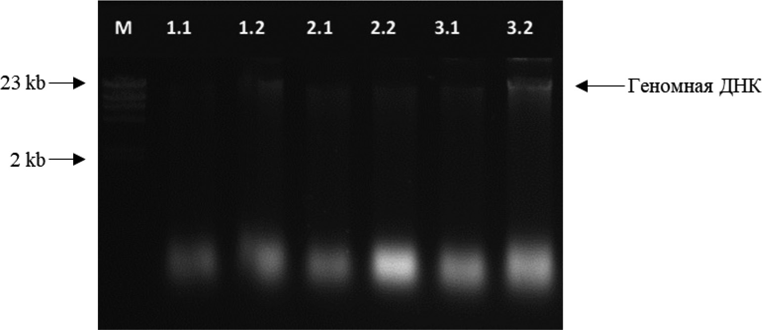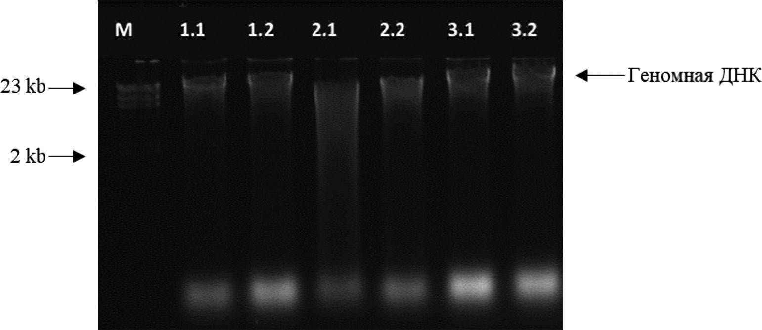 Метод экстракции с применением коммерческого набора ГМО-СОРБ-Б основан на лизисе клеток со CTAB, очистке хлороформом, сорбции ДНК на силиконизированных частицах и ее последующем осаждении. Высокомолекулярная ДНК визуально заметна в образцах, которые были подвергнуты лизису в течение 1 ч, ее размер ориентировочно составляет 23 kb, концентрация – 580 нг/мкл (рис.1). В образцах с увеличением времени лизиса до 2 и 3 ч были выделены, в основном, низкомолекулярные фрагменты, а высокомолекулярная ДНК практически отсутствовала. Такие результаты, вероятно, связаны с низкой эффективностью данного набора в применении к насекомым, так как основная область его использования в соответствии с инструкцией – растительные и пищевые субстраты. Рекомендованная длительность лизиса для него составляет 1 ч, а увеличение времени могло негативно сказаться на результатах. В работе [7], где также был набор ГМО-СОРБ-Б, концентрация оказалась выше 70 нг/мкл. Преимущество этого способа выделения ДНК – быстрота и отсутствие необходимости работы с фенолом (токсичный реактив).