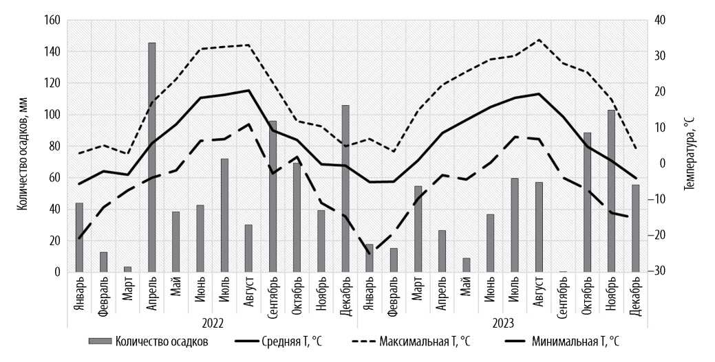 Выводили в культуру in vitro в два периода – апрель и июнь. Характеристику климатических условий осуществляли с использованием данных метеонаблюдений с января 2022 года по декабрь 2023, полученных на метеорологической станции ВНИИСПК (рис. 1).