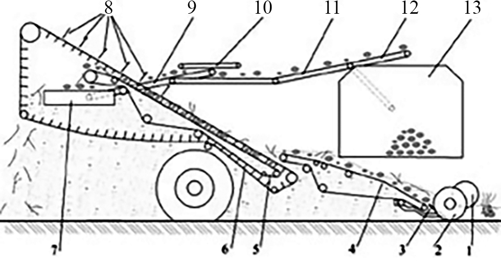 Рис. 5. Технологическая схема комбайна «Grimme» SE 150/60. 1 – катки; 2 – вертикальные диски; 3 – лемех; 4, 5 – первый и второй элеваторы; 6 – ботвоудаляющий транспортер; 7, 9, 10 – первое, второе и третье сепарирующие устройства; 8 – гребенчатый ботвоудалитель; 11 – переборочный стол; 12 – загрузочный элеватор; 13 – бункер.