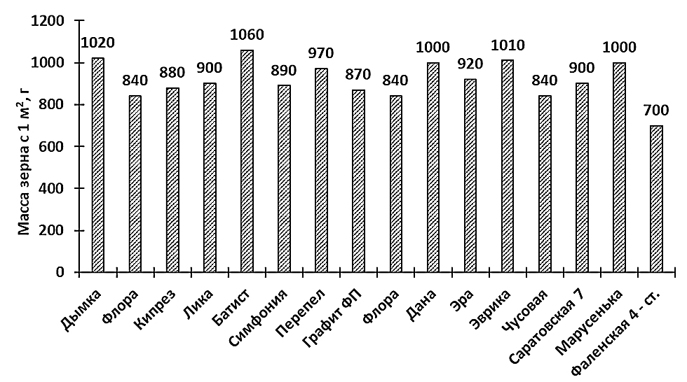 Большинство изученных сортообразцов (Батист, Дымка, Перепел, Лика, Симфония, Кипрез, Графит ФП, Флора, Эврика, Дана, Марусенька, Эра, Саратовская 7, Чусовая) достоверно (при P≥0,95) превосходили стандарт Фаленская 4 по урожайности (рис. 1). У сортов ФАНЦ Северо-Востока она составила в среднем 761,6 г/ м2, других отечественных сортов – 864,7 г/ м2 (НСР05= 41,9; Р = 1,8 %).