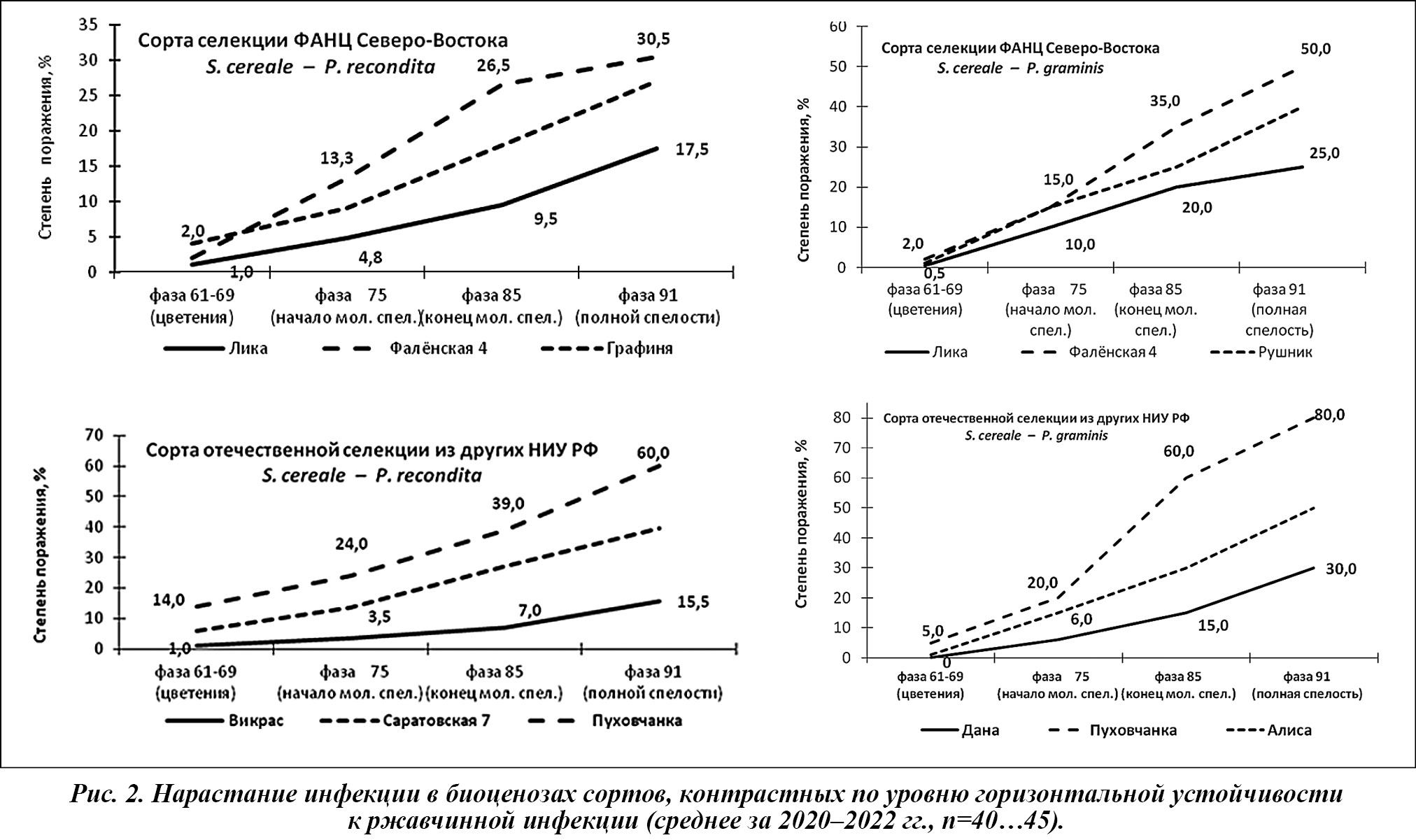 Рис. 2. Нарастание инфекции в биоценозах сортов, контрастных по уровню горизонтальной устойчивости к ржавчинной инфекции (среднее за 2020–2022 гг., n=40…45).