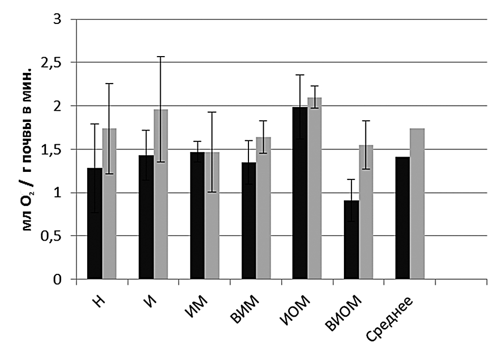 Максимальная в эксперименте активность каталазы отмечена на интенсивном фоне (И) в СЛ ВГГ: в слое 0…20 см – 2,41 О2 / г почвы; в слое 20…40 см – 1,96 мл О2 / г почвы. В среднем активность каталазы в СЛ ВГГ была выше на всех фонах интенсификации. В слое почвы 0…40 см на интенсивном фоне разница составляла 13 %.