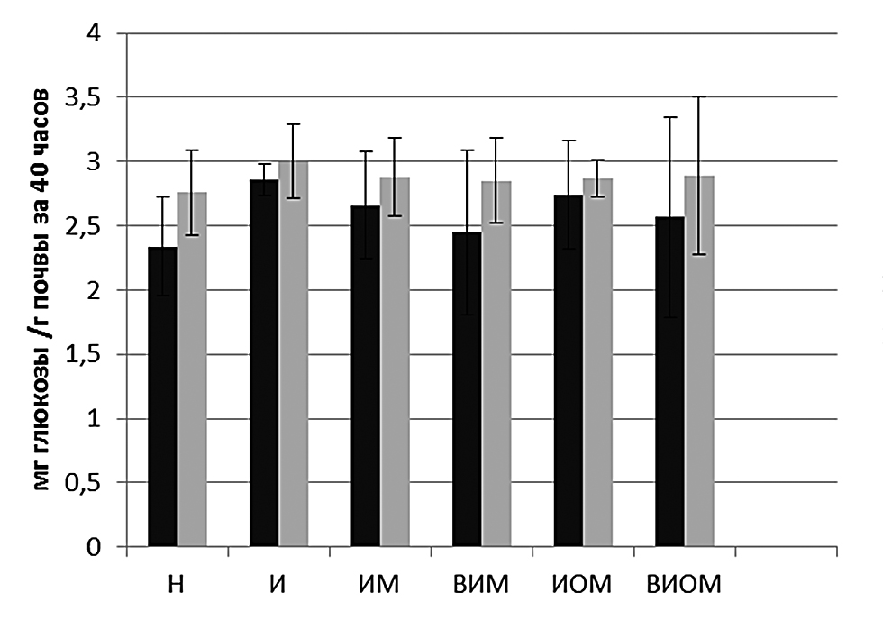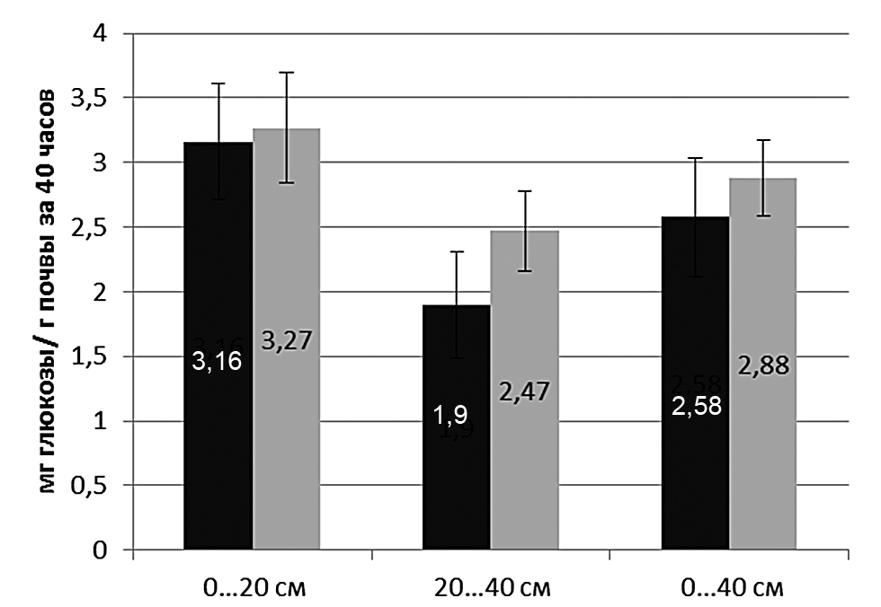 Наибольшая в эксперименте активность фермента в почвенных разностях отмечена в слое 0…20 см. В серой лесной почве средняя величина этого показателя составляла 3,16 мг глюкозы/ г почвы за 40 ч, в серой лесной со вторым гумусовым горизонтом – 3,27 мг глюкозы/ г почвы за 40 ч. Статистически достоверные различия в активности фермента между почвенными разностями отмечены в слое 20…40 см – 1,9 и 2,47 мг глюкозы/ г почвы за 40 ч соответственно. Инвертазная активность второго гумусового горизонта была в среднем на 30 % выше, чем в серой лесной почве на глубине 20…40 см (рис. 2).