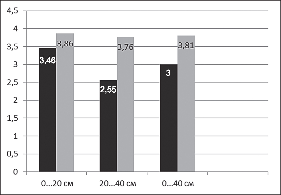 Содержание гумуса во втором гумусовом горизонте (20…40 см) находится на уровне пахотного слоя, что создает благоприятные условия для развития сельскохозяйственных растений. Среднее содержание гумуса в СЛ почве в слое 20…40 см было на 33 % ниже, чем во втором гумусовом горизонте.