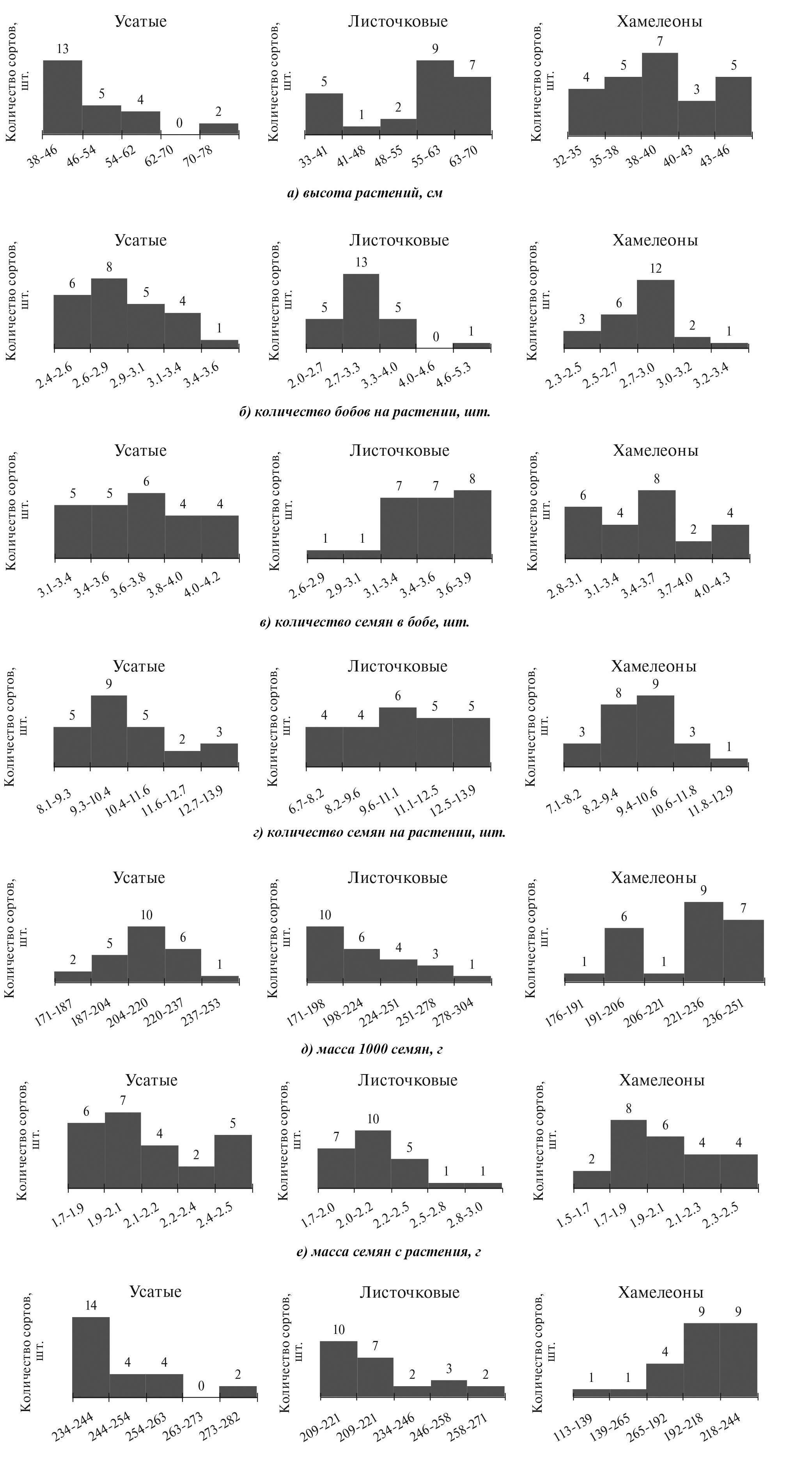 Наибольшим количеством семян в бобе среди «усатых» сортов (по 4,2 шт.) характеризовались Юбиляр (СамНЦ РАН), Шрек (ТюмНЦ СО РАН), Тренди (Чехия); листочковых (по 3,9 шт.) – 13–24 (Уральский НИИСХ), Тюменский кормовой (ТюмНЦ СО РАН), Эдем (Уральский НИИСХ); «хамелеонов» (4,3 шт.) – Аз-93–1995 (ФНЦ ЗБК).