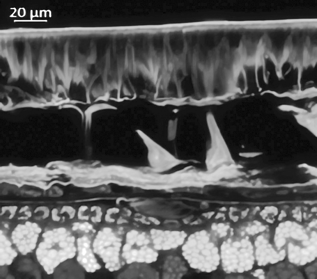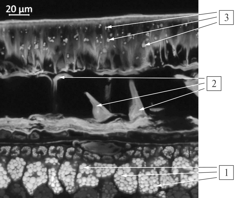 С использованием лазерного конфокального микроскопа CLSM 800 (Zeiss, Германия) определяли параметры автофлуоресценции среза семян. Выявлено 4 основных пика автофлуоресценции: при возбуждении УФ-лазером (405 нм) – максимумы излучения в диапазонах 410…450 нм, 495…550 нм и 570…610 нм; при возбуждении синим лазером (488 нм) – максимум излучения составляет 575…610 нм, что соответствует максимуму излучения антоцианов. Изображения были получены с использованием увеличения 10× и 20× и модуля Airyscan для увеличения разрешения.