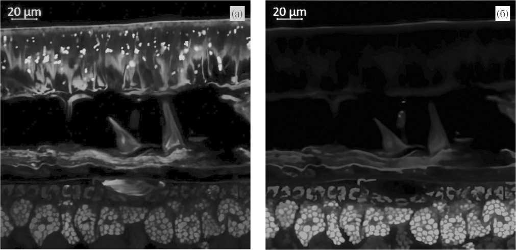 Зеленая автофлуоресценция (рис. 3), индуцированная синим светом, в диапазоне 500…545 нм может быть объяснена присутствием флавонов, флавонолов, флаван-3-олов (апигенина, генистеина, лютеолина, изорамнетина, лютеолина, эпикатехина и др.) и их производных [26, 27].