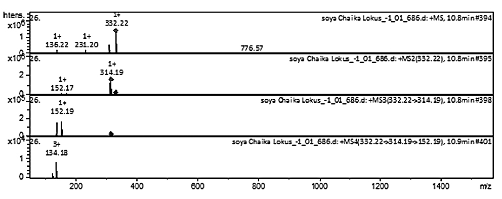 Для получения высококонцентрированных экстрактов проводили дробную мацерацию. Для анализа отбирали 50 г семян сои сорта Локус, при этом общее количество экстрагента (метилового спирта х. ч.) разделяли на 3 части и последовательно настаивали семена сои сначала с первой частью, затем со второй и третьей. Время экстрагирования каждой части представленной растительной матрицы составляло 7 дней [13]. Для идентификации в экстрактах целевых аналитов использовали высокоэффективную жидкостную хроматографию (ВЭЖХ) в комплексе с ионной ловушкой BRUKER DALTONIKS (тандемная масс-спектрометрия).