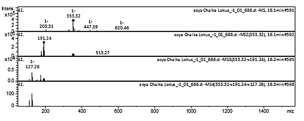 Рис. 5. Масс-спектр соединения хлорогеновой кислоты, полученный из экстракта семян сои сорта Локус (верхняя линия ‒ МС-скан в диапазоне 100…1700 m/z, далее спектры фрагментации (сверху вниз): МС2 протонированного иона хлорогеновой кислоты (353,32 m/z), МС3 фрагмента 353,32→191,24 m/z и МС4 фрагмента 353,32→191,24→127,26).