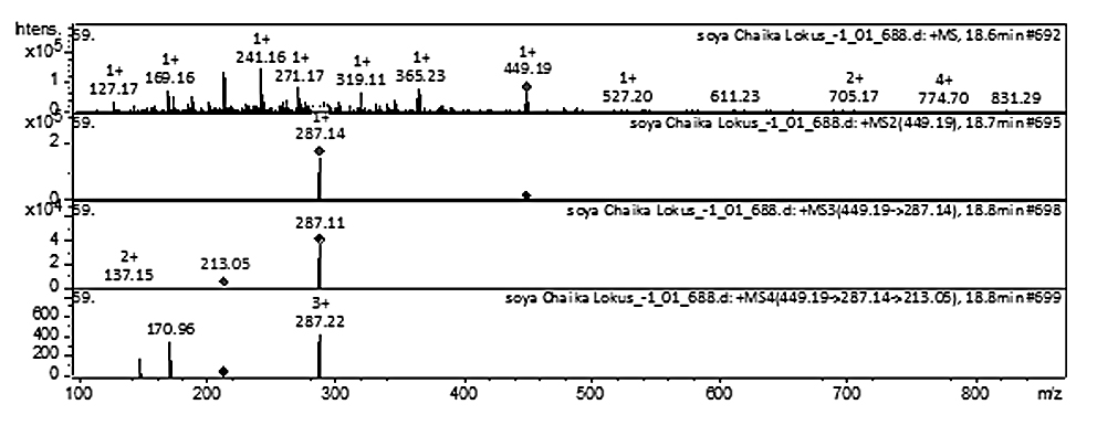 Рис. 6. Масс-спектр соединения цианидина 3-О-глюкозида, полученный из экстракта семян сои сорта Локус (верхняя линия ‒ МС-скан в диапазоне 100…1700 m/z, далее спектры фрагментации (сверху вниз): МС2 протонированного иона цианидина 3-О-глюкозида (449,19 m/z), МС3 фрагмента 449,19→287,14 m/z и МС4 фрагмента 449,19→287,14→213,05).