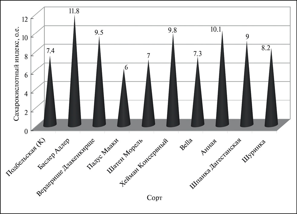 Основная часть растворимых сухих веществ приходится на сахара, определяющие вкусовые свойства плодов. За годы проведения исследований, среднее их содержание в зависимости от генотипа изменялось от 9,0 (Bella) до 12,2 % (Шуринка), при средней величине этого показателя по всей выборке 10,4 % и коэффициенте вариации 11,0 % (см. табл. 2). Все изучаемые сорта по способности плодов к сахаронакоплению превосходили сорт стандарт Подбельская на 0,1...3,3 %. Самые высокие концентрации сахаров обнаружены в плодах интродуцентов Баслер Адлер (11,2 %) и Хейман Консервный (11,6 %), а среди сортов местной селекции высокой сахаристостью выделялись Шпанка Дагестанская (11,4 %) и Шуринка (12,2 %). Коэффициент вариации (СV = 1,0 %) иллюстрирует средний уровень изменчивости величины этого показателя в зависимости от сортовой специфики (см. табл. 2).