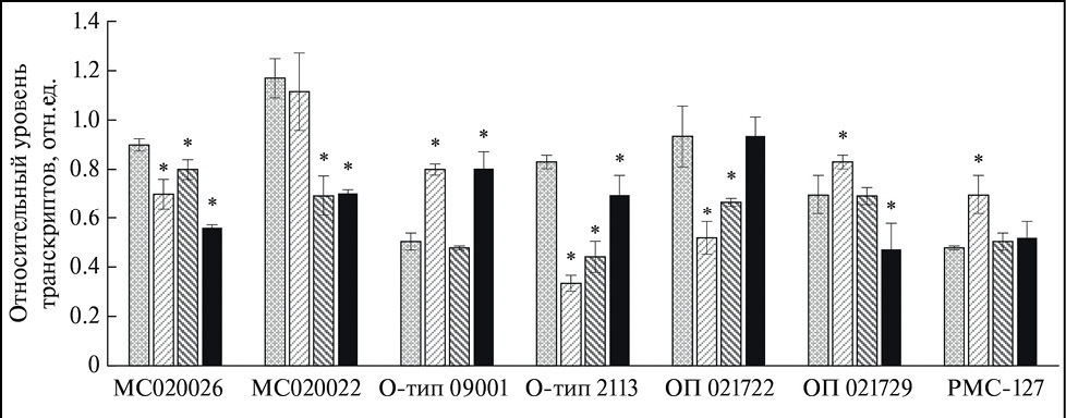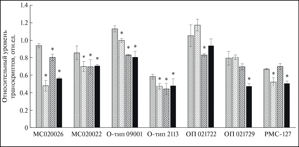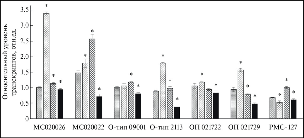 Ген OSM, участвующий в реакции на возбудителей болезней, предположительно, наряду с геном MsIC, может участвовать в механизме адаптации сахарной свеклы к абиотическому стрессу [16]. У всех образцов, обработанных солевым раствором, его экспрессия гена была ниже либо на уровне контроля (рис. 4). Следовательно, можно предположить, что у изученных генотипов сахарной свеклы ген OSM не участвует в адаптации к солевому стрессу.