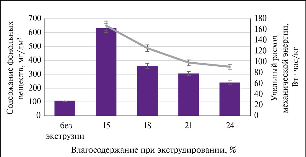 Степень такого воздействия определяется уровнем удельных затрат механической энергии, которая в свою очередь изменяется варьированием влагосодержания при переработке смесей. Коэффициент корреляции между содержанием фенольных веществ и значением удельной механической энергии составил 0,98, что указывает на сильную положительную связь. То есть, уровень влагосодержания выступает не только фактором управления структурно-механическими и гидратационными свойствами экструдатов, но и позволяет изменять содержание фенольных веществ.