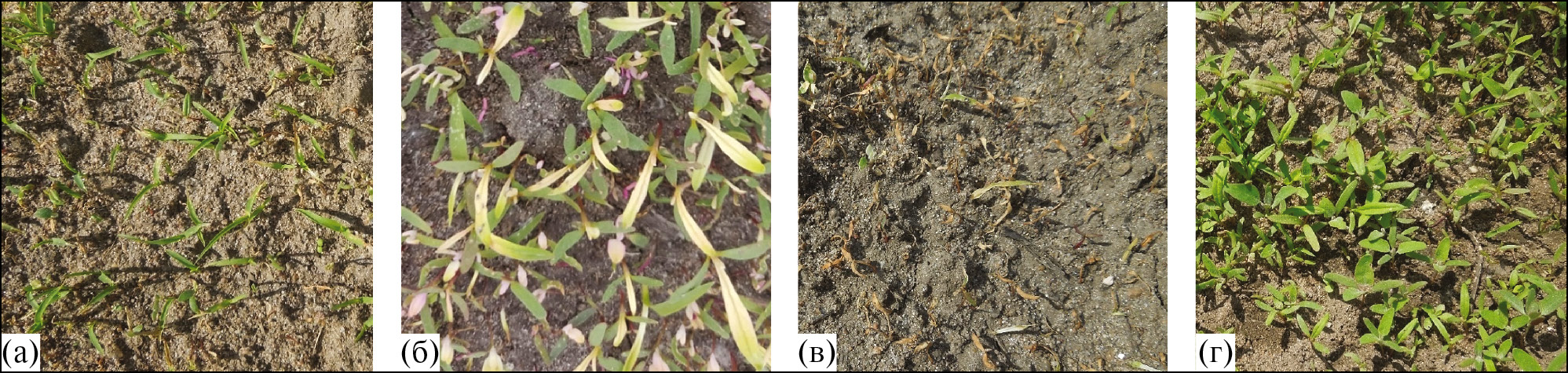 Первые признаки воздействия гербицидов на сорные растения отмечали через 3…4 дня после обработки. В вариантах с применением гербицида Нексус, ВР они заключались в появлении некрозов, деформации и усыхании двудольных сорных растений; у однолетних злаковых видов отмечали только слабые ожоги кончиков листьев. Использование гербицида Трейсер, КЭ вызывало осветление (побеление), скручивание и увядание сорных растений. На делянках, обработанных баковой смесью гербицидов, наблюдали осветление, появление некрозов, скручивание, усыхание и гибель сорных растений (рис. 2).