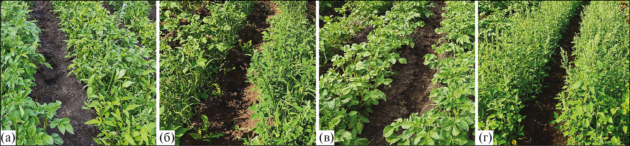 Рис. 3. Действие гербицидов и их баковой смеси на засоренность посадок картофеля через 30 дней после обработки (2023 г.): а – Нексус, ВР (1,25 л/га); б – Трейсер, КЭ (0,5 л/га); в – баковая смесь Нексус, ВР + Трейсер, КЭ (1,25 л/га + 0,5 л/га); г – контроль.