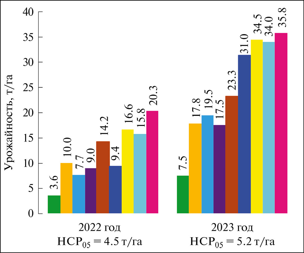 В 2022 г. из-за достаточного увлажнения и высоких температур воздуха посадки картофеля были засорены представителями как малолетних двудольных (гречишка вьюнковая, звездчатка средняя, марь белая, горец развесистый, торица полевая, галинсога мелкоцветная и желтушник левкойный), так и однолетних злаковых (ежовник обыкновенный) сорных растений. Погодные условия 2023 г. характеризовались более низкими, по сравнению со среднемноголетними, температурами воздуха, что приводило к замедлению развития растений ежовника обыкновенного, что, в свою очередь, сопровождалось зарастанием контроля марью белой. При этом в посадках отсутствовали звездчатка средняя и галинсога мелкоцветная.