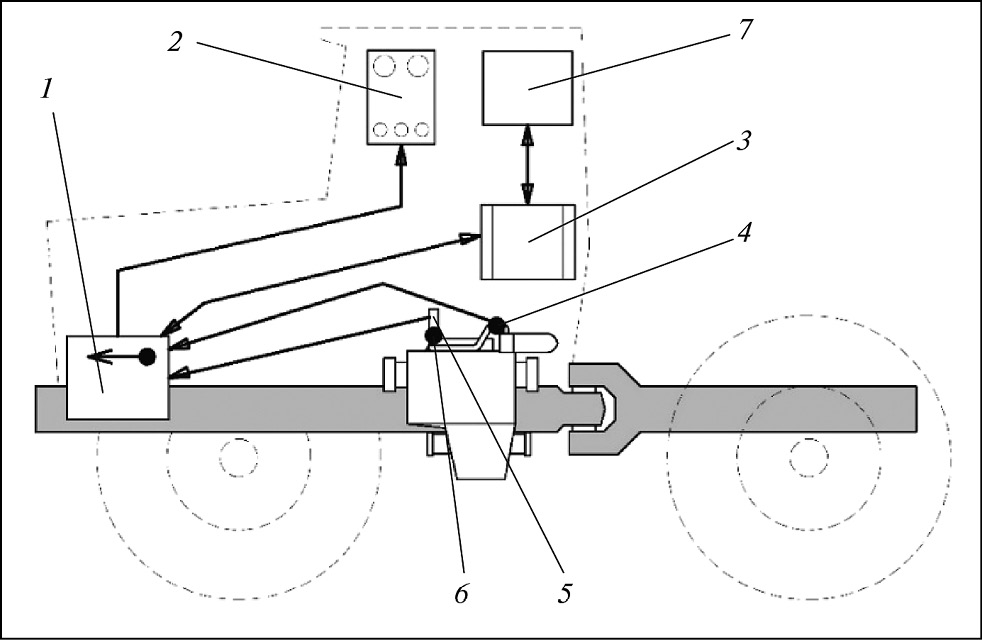 Рис. 2. Схема устройства для интеллектуального мониторинга КП с гидравлической системой управления: 1 – модуль измерений с акселерометром, 2 – модуль индикации, 3 – модуль интеллектуального диагностирования, 4 – накладной датчик температуры, 5 – переходник для подключения к системе контроля давления, 6 – штатный датчик давления, 7 – телематический терминал