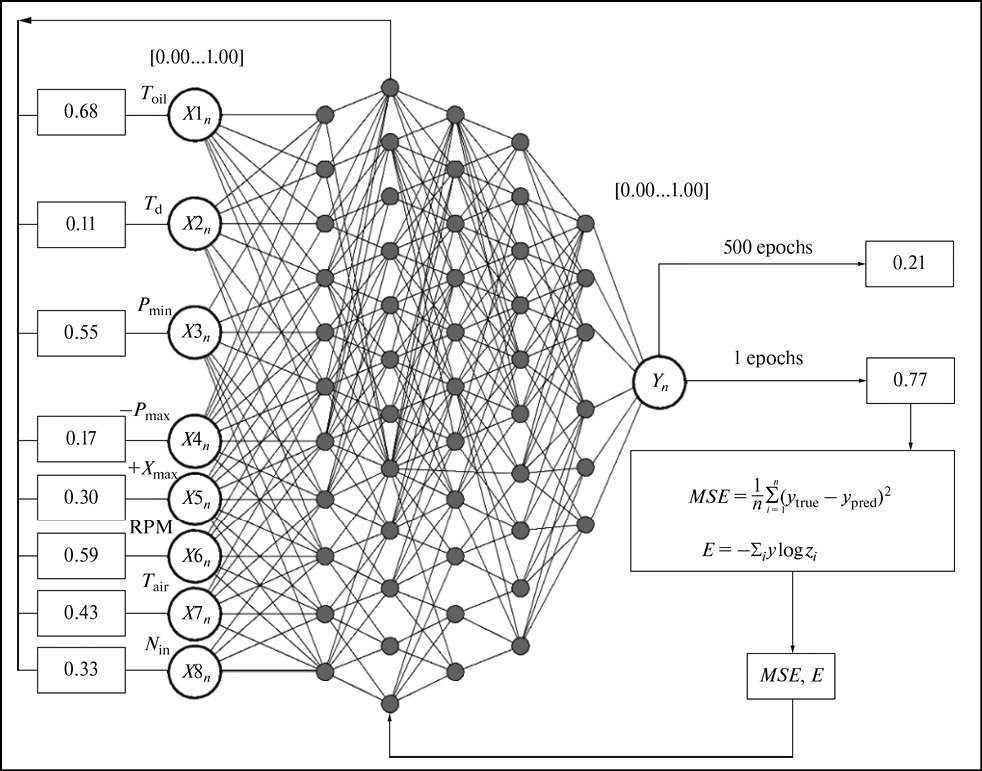 Разработанные для безразборного интеллектуального диагностирования НС представляют собой отдельные многослойные модели, где на входе используются функциональные диагностические параметры работы агрегата, а на выходе формируется параметр оценки его общего технического состояния. На основе поступающей информации формируется база данных параметров работы КП, которая в дальнейшем преобразуется в значения входного слоя НС.