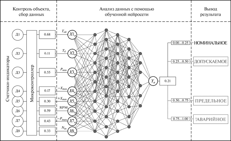Методика. Основные задачи использования ИИ и НС в целях получения максимального эффекта в области управления техническим состоянием по заранее выбранному критерию (экономическому, техническому, технологическому) заключаются в следующем: сбор данных о параметрах работы машины, узла или агрегата [7]; обработка и анализ полученных данных с использованием ИИ с целью определения текущего актуального технического состояния контролируемого объекта; прогнозирование динамики изменения технического состояния объекта [3]; подготовка или принятие решения (выдача командной информации) об изменении параметров работы и регулировок или необходимости проведения технического обслуживания или ремонта.