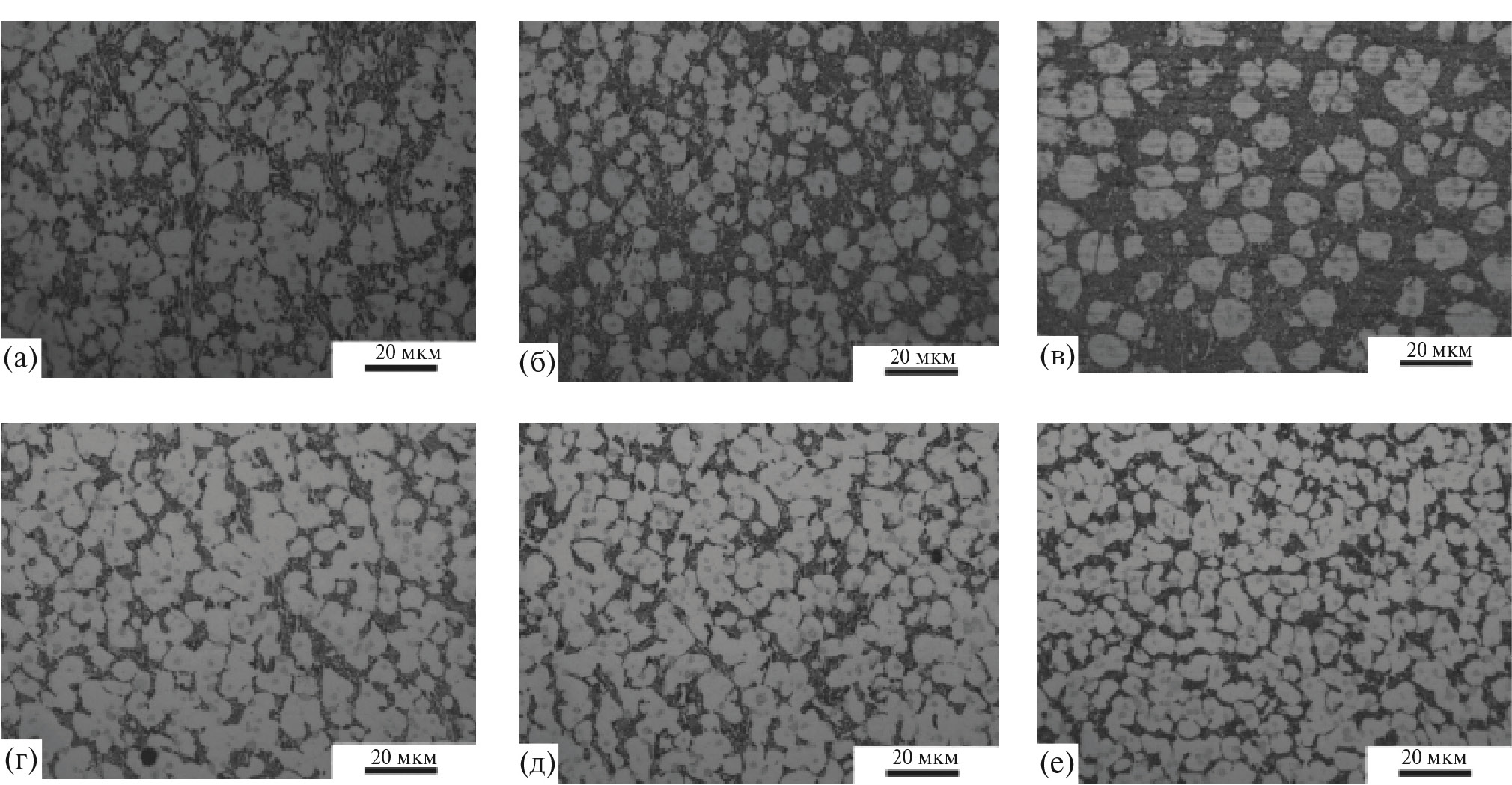 Дальнейшее увеличение содержания карбида способствует повышению скорости охлаждения и снижению температурного градиента, что приводит к формированию ячеистой структуры (рис. 4е). Для получения данной структуры режим наплавки имеет следующие значения: мощность лазерного излучения – 2900 Вт, скорость наплавки – 11 мм/с, содержание карбида вольфрама – 55 % от объема.