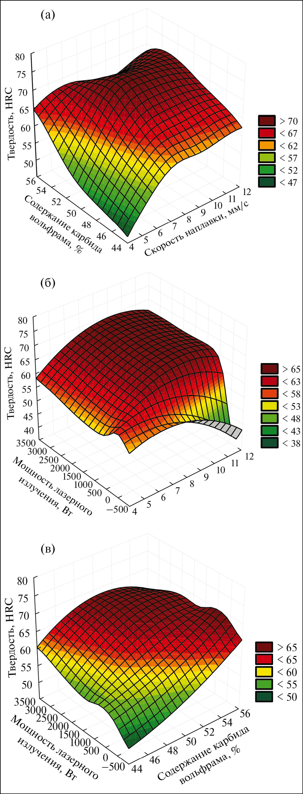 Результаты анализа поверхности отклика, характеризующей зависимость твердости наплавленной поверхности от мощности лазерного излучения и скорости наплавки (рис. 5б), свидетельствуют, что наибольшая твердость достигается при следующих значениях: мощность лазерного излучения – 2300…2500 Вт, а скорость наплавки – 7…9 мм/с.