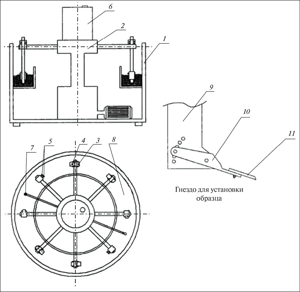 Рис. 1. Круговой почвенный стенд: 1 – каркас, 2 – приводной механизм, 3 – уплотнительные катки, 4 – грузы, 5 – рыхлители, 6 – резервуар для воды, 7 – капельница, 8 – круговой почвенный канал, 9 – приспособление для крепления испытуемых образцов, 10 – гнездо для установки, 11 – испытуемый образец
