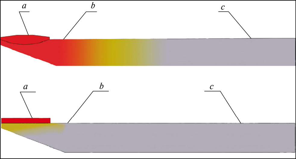 Рис. 2. Модель нагрева образца при упрочнении: а) плазменно-порошковой наплавкой (образец № 1, № 4); б) селективным лазерным спеканием (образец № 2, № 3): а – зона защитного слоя, b – 10 мм от наплавки, с – основа образца