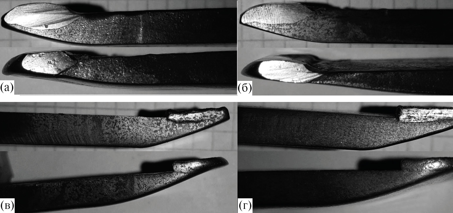 Рис. 3. Экспериментальные образцы (верх – первоначальное состояние, низ – изношенное состояние), упрочненные методом плазменно-порошковой наплавки в среде сжатого воздуха (а – образец № 4; б – образец № 1) и методом селективного лазерного спекания (в – образец № 2; г – образец № 3)