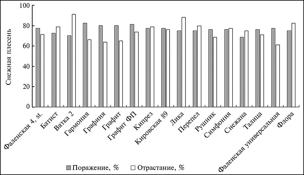 Комплексной устойчивостью к снежной плесени и корневым гнилям обладали такие сортообразцы, как Флора, Рушник, Гармония, Графит, Графит ФП, Перепел. Они могут быть использованы в качестве источников в селекции на фитоиммунитет.