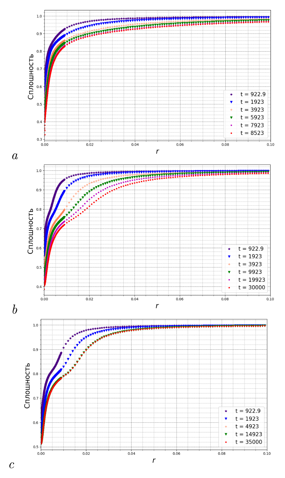 Рис. 9. Распределение сплошности c течением времени в a–c модели 3.1, d–f в модели 3.3