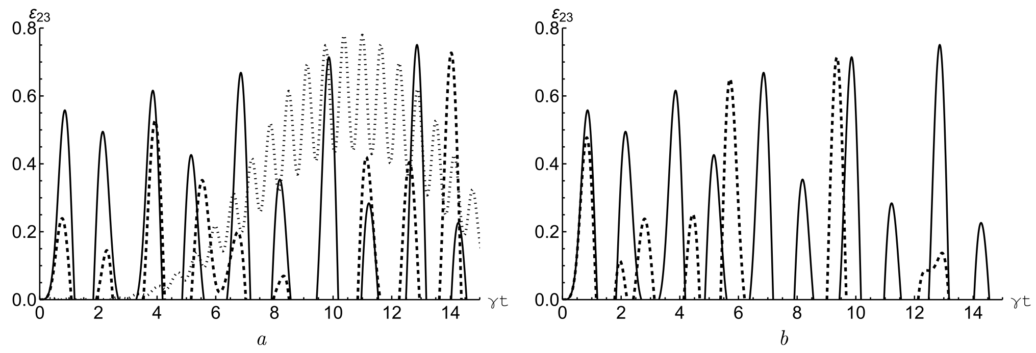 Рис. 2.3. Зависимость отрицательностей ( a) от приведенного времени для начального состояния кубитов . Число фотонов в моде резонатора выбрано равным . Значения параметров расстройки керровской нелинейности в случае а): , (сплошная линия); , (штриховая линия) и , (пунктирная линия). В случае б): , (сплошная линия) и , (пунктирная линия)