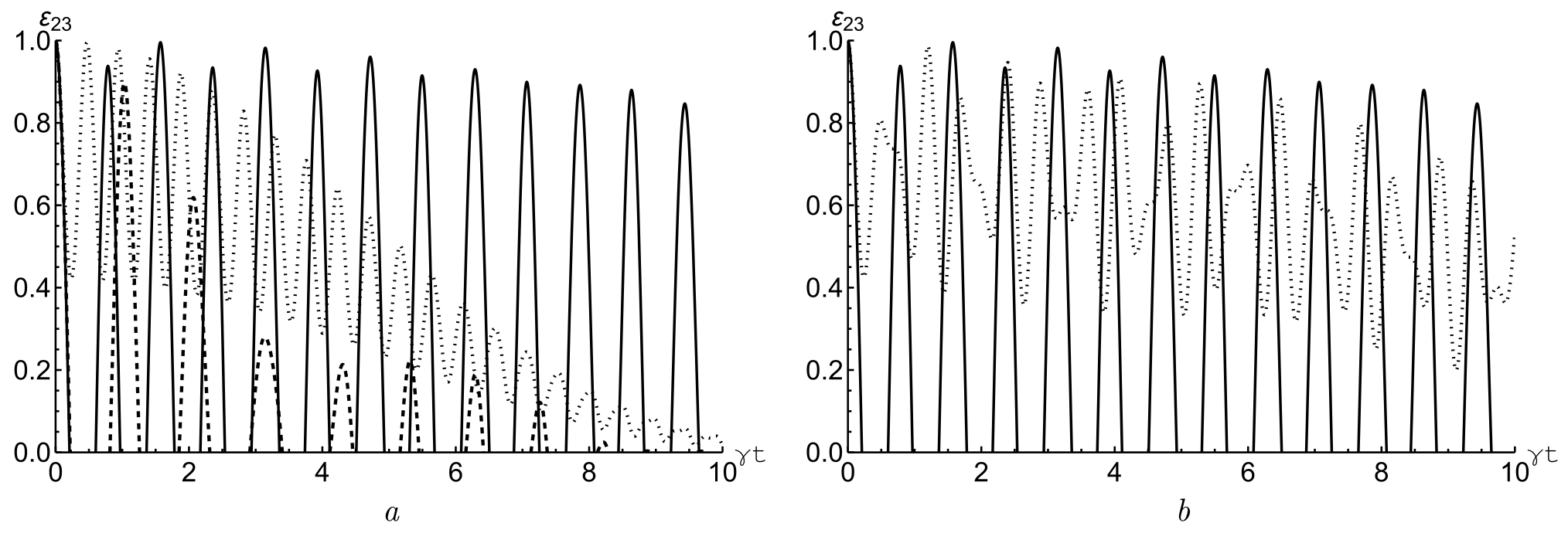 Fig. 2.1. Dependence of the negatives ( a) on the reduced time for the initial state of qubits . The number of photons in the resonator mode is chosen to be . Values of Kerr nonlinearity detuning parameters in case a): , (solid line); , (dashed line) and , (dotted line). In case b): , (solid line) and , (dotted line)