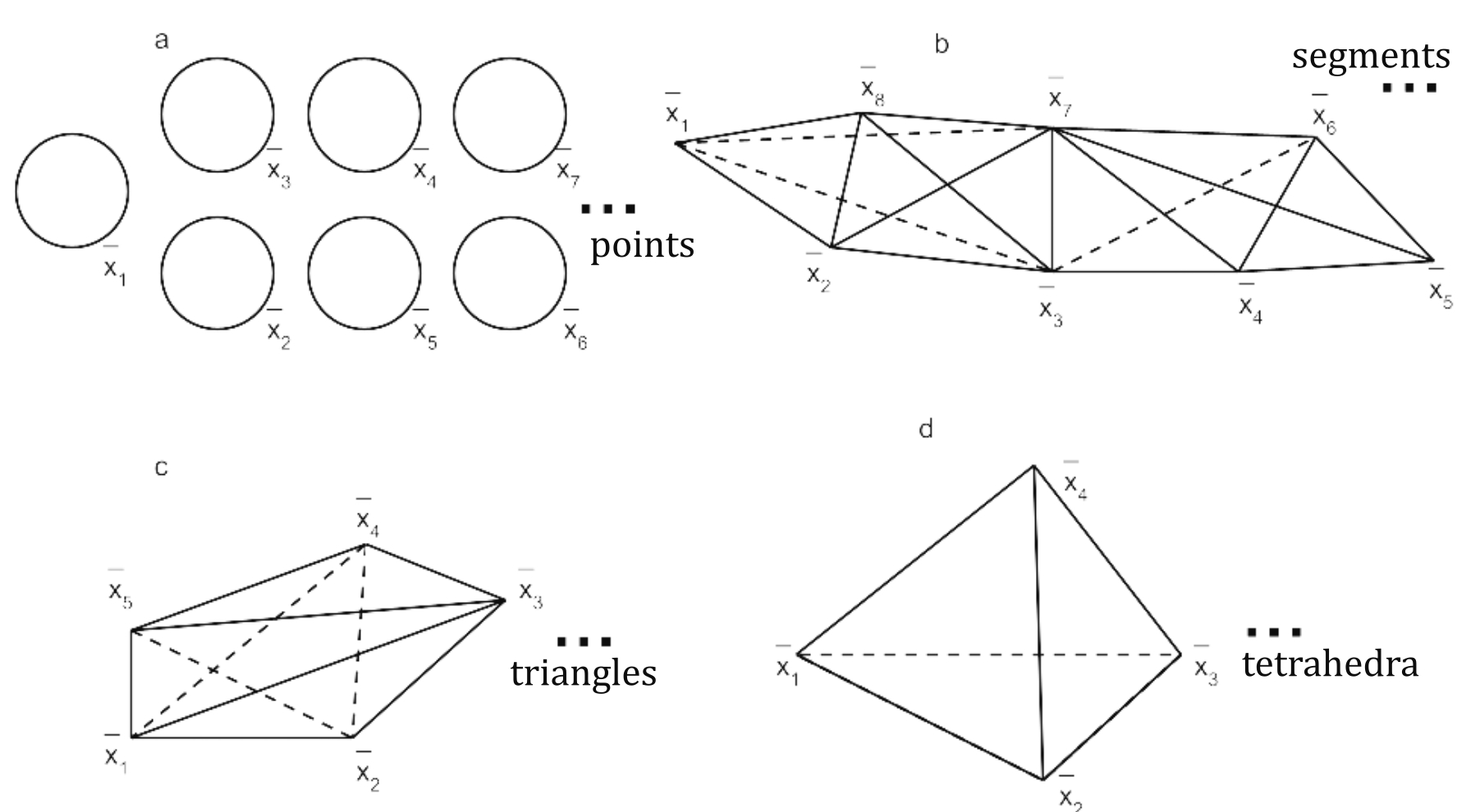 Рис. Иллюстрации к теоремам: a — z0(x) — x; b — z1(x) — отрезки, вершины — точки X (одномерные симплексы); c — z2(x) — треугольники, вершины — точки X (двумерные симплексы; d — z3(x) — тетраэдры, вершины — точки X (трехмерные симплексы)