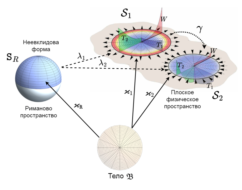 В лекции "О гипотезах, лежащих в основании геометрии" Риман [1] впервые выдвинул идею -мерного многообразия, снабженного метрическим тензором. Последний определяет на многообразии дифференциал расстояния между бесконечно близкими элементами, а также вводит на нем специфическое правило параллельного переноса. Спустя время, в конце XIX века, идея Римана нашла свое применение в физике и, в частности, в механике континуума. По-видимому, первым, кто применил неевклидову геометрию в теории упругости, был Бельтрами [2], который сформулировал линейные уравнения баланса в пространстве с неевклидовым метрическим тензором. Появление теории относительности инициировало дальнейшие исследования в механике континуума, в которых рассматривалось движение тела в плоском или искривленном пространстве-времени [3]. Следует отметить, что перенос классических положений механики континуума на релятивистский случай таит в себе ряд принципиальных трудностей, поскольку привычные понятия длины угла и времени зависят от наблюдателя. В частности, определение жесткого движения требует особого подхода, развитого в работах Борна [4; 5] и Герглотца [6] для случая специальной теории относительности и в работе Нордстрёма [7] для случая общей теории относительности. Таким образом, первоначально неевклидовой структурой снабжалось пространство, в котором наблюдалось движение деформируемого континуума.
