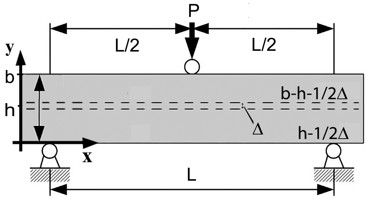 Рассмотрим балку прямоугольного поперечного сечения S MathType@MTEF@5@5@+= feaahqart1ev3aaatCvAUfeBSjuyZL2yd9gzLbvyNv2CaerbuLwBLn hiov2DGi1BTfMBaeXatLxBI9gBaerbd9wDYLwzYbItLDharqqtubsr 4rNCHbGeaGqiVu0Je9sqqrpepC0xbbL8F4rqqrFfpeea0xe9Lq=Jc9 vqaqpepm0xbba9pwe9Q8fs0=yqaqpepae9pg0FirpepeKkFr0xfr=x fr=xb9adbaqaaeGaciGaaiaabeqaamaabaabaaGcqqaaaaaaaaGqSf 2yRbWdbeaapaGaam4uaaaa@38DB@ из двух слоев различной толщины из упругих однородных материалов в условиях трехточечного нагружения. Нижний слой, противоположный стороне приложения нагрузки P, MathType@MTEF@5@5@+= feaahqart1ev3aaatCvAUfeBSjuyZL2yd9gzLbvyNv2CaerbuLwBLn hiov2DGi1BTfMBaeXatLxBI9gBaerbd9wDYLwzYbItLDharqqtubsr 4rNCHbGeaGqiVu0Je9sqqrpepC0xbbL8F4rqqrFfpeea0xe9Lq=Jc9 vqaqpepm0xbba9pwe9Q8fs0=yqaqpepae9pg0FirpepeKkFr0xfr=x fr=xb9adbaqaaeGaciGaaiaabeqaamaabaabaaGcqqaaaaaaaaGqSf 2yRbWdbeaapaGaamiuaiaaiYcaaaa@398E@ обозначим индексом 1 MathType@MTEF@5@5@+= feaahqart1ev3aaatCvAUfeBSjuyZL2yd9gzLbvyNv2CaerbuLwBLn hiov2DGi1BTfMBaeXatLxBI9gBaerbd9wDYLwzYbItLDharqqtubsr 4rNCHbGeaGqiVu0Je9sqqrpepC0xbbL8F4rqqrFfpeea0xe9Lq=Jc9 vqaqpepm0xbba9pwe9Q8fs0=yqaqpepae9pg0FirpepeKkFr0xfr=x fr=xb9adbaqaaeGaciGaaiaabeqaamaabaabaaGcqqaaaaaaaaGqSf 2yRbWdbeaapaGaaGymaaaa@38BE@ , а верхний слой MathType@MTEF@5@5@+= feaahqart1ev3aqatCvAUfeBSjuyZL2yd9gzLbvyNv2CaerbuLwBLn hiov2DGi1BTfMBaeXatLxBI9gBaerbd9wDYLwzYbItLDharqqtubsr 4rNCHbGeaGqiVu0Je9sqqrpepC0xbbL8F4rqqrFfpeea0xe9Lq=Jc9 vqaqpepm0xbba9pwe9Q8fs0=yqaqpepae9pg0FirpepeKkFr0xfr=x fr=xb9adbaqaaeGaciGaaiaabeqaamaabaabaaGcqqaaaaaaaaGqSf 2yRbWdbeaaruWqHXwAIjxAaGqbaKqzGfaeaaaaaaaaa8GacaWFuaca aa@3C73@ индексом 2 MathType@MTEF@5@5@+= feaahqart1ev3aaatCvAUfeBSjuyZL2yd9gzLbvyNv2CaerbuLwBLn hiov2DGi1BTfMBaeXatLxBI9gBaerbd9wDYLwzYbItLDharqqtubsr 4rNCHbGeaGqiVu0Je9sqqrpepC0xbbL8F4rqqrFfpeea0xe9Lq=Jc9 vqaqpepm0xbba9pwe9Q8fs0=yqaqpepae9pg0FirpepeKkFr0xfr=x fr=xb9adbaqaaeGaciGaaiaabeqaamaabaabaaGcqqaaaaaaaaGqSf 2yRbWdbeaapaGaaGOmaaaa@38BF@ . Толщина слоев и их пропорции могут быть различными, но сумма толщин равна фиксированной величине толщины балки b MathType@MTEF@5@5@+= feaahqart1ev3aaatCvAUfeBSjuyZL2yd9gzLbvyNv2CaerbuLwBLn hiov2DGi1BTfMBaeXatLxBI9gBaerbd9wDYLwzYbItLDharqqtubsr 4rNCHbGeaGqiVu0Je9sqqrpepC0xbbL8F4rqqrFfpeea0xe9Lq=Jc9 vqaqpepm0xbba9pwe9Q8fs0=yqaqpepae9pg0FirpepeKkFr0xfr=x fr=xb9adbaqaaeGaciGaaiaabeqaamaabaabaaGcqqaaaaaaaaGqSf 2yRbWdbeaapaGaamOyaaaa@38EA@ .