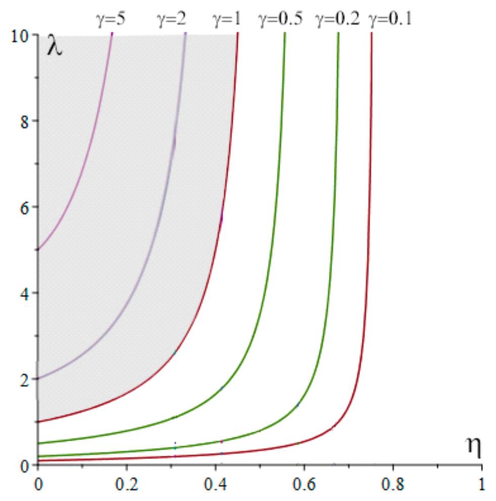 Учитывая положительность параметров, мы получаем зависимость параметров двухслойности , при которых максимальное напряжение достигает предела прочности на нижнем крае ранее верхнего слоя, а не нижнего: