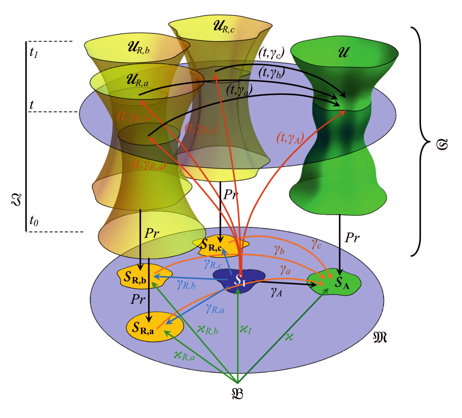 5°. Поскольку в рамках настоящей работы релятивистские эффекты не учитываются, изменения напряженно-деформированного состояния и связанных с ним полей дефектов можно рассматривать как зависимости от абсолютного времени. Оно количественно характеризуется координатами отдельного одномерного (хронометрического) многообразия , топологически эквивалентного :