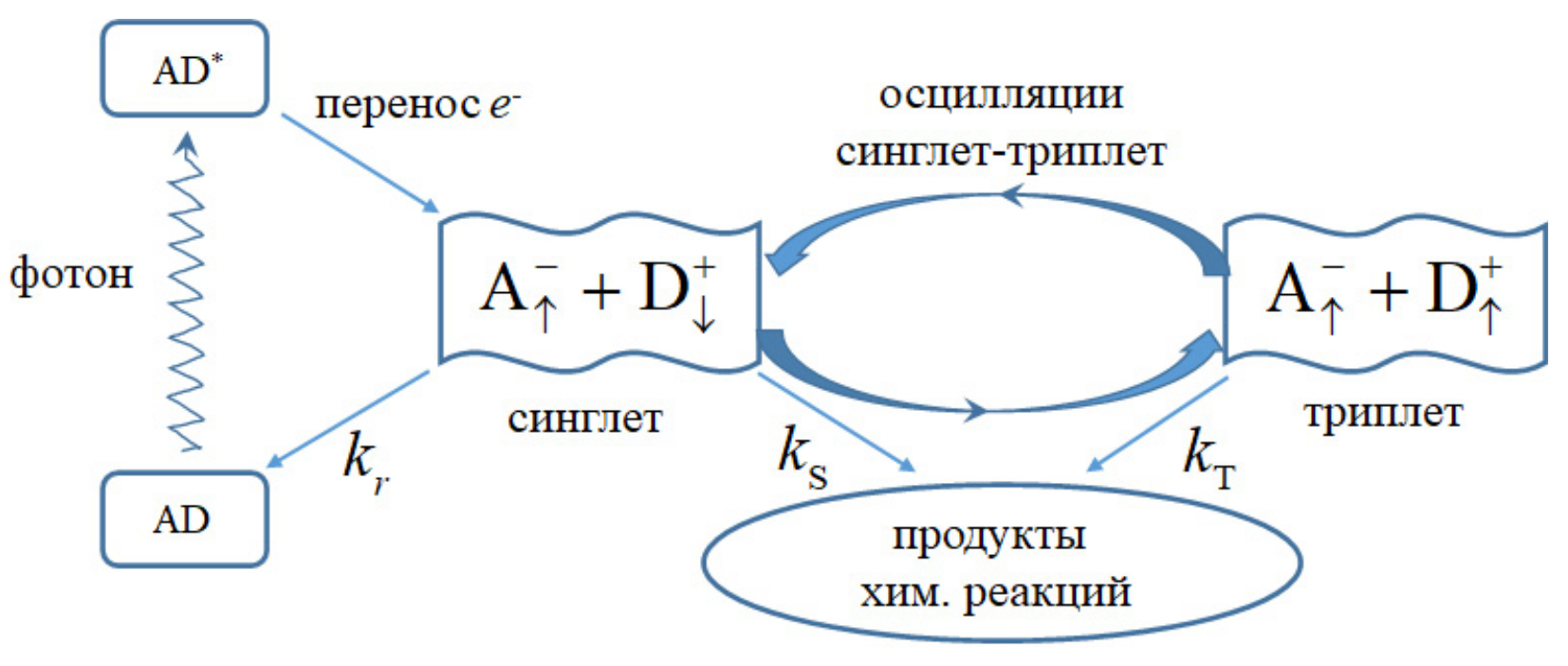 Итак, согласно описанному выше сценарию, реакции в донорно-акцепторной паре молекул происходят в три этапа. На первом этапе молекула донора, поглотив фотон, переходит в возбужденное электронное состояние и отдает электрон на молекулу акцептора , в результате чего образуется пара радикалов . Для эффекта магнитного поля крайне важно, чтобы радикальная пара образовывалась в определенном спин-коррелированном, синглетном или триплетном, электронном состоянии. Обычно фотовозбужденный донор и акцептор находятся в синглетном состоянии до переноса электрона. В этом случае перенос электрона не меняет спиновую корреляцию и общее синглетное состояние.